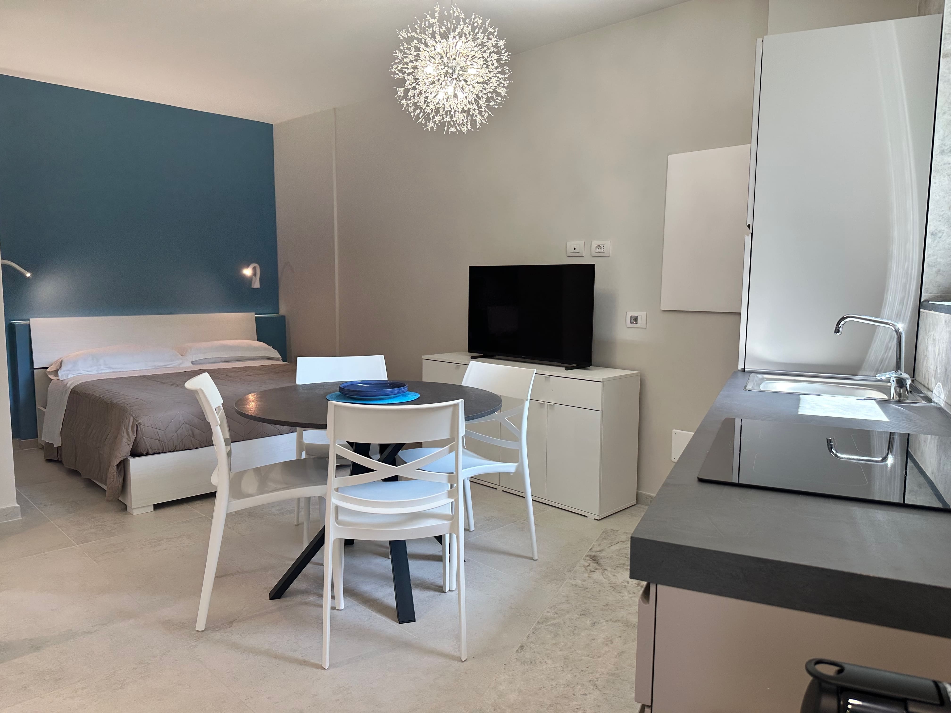 Spacious open-plan studio apartment featuring a sleeping area with a double bed and a living area with a sofa bed (140 cm wide), a smart TV, and a fully equipped kitchenette.