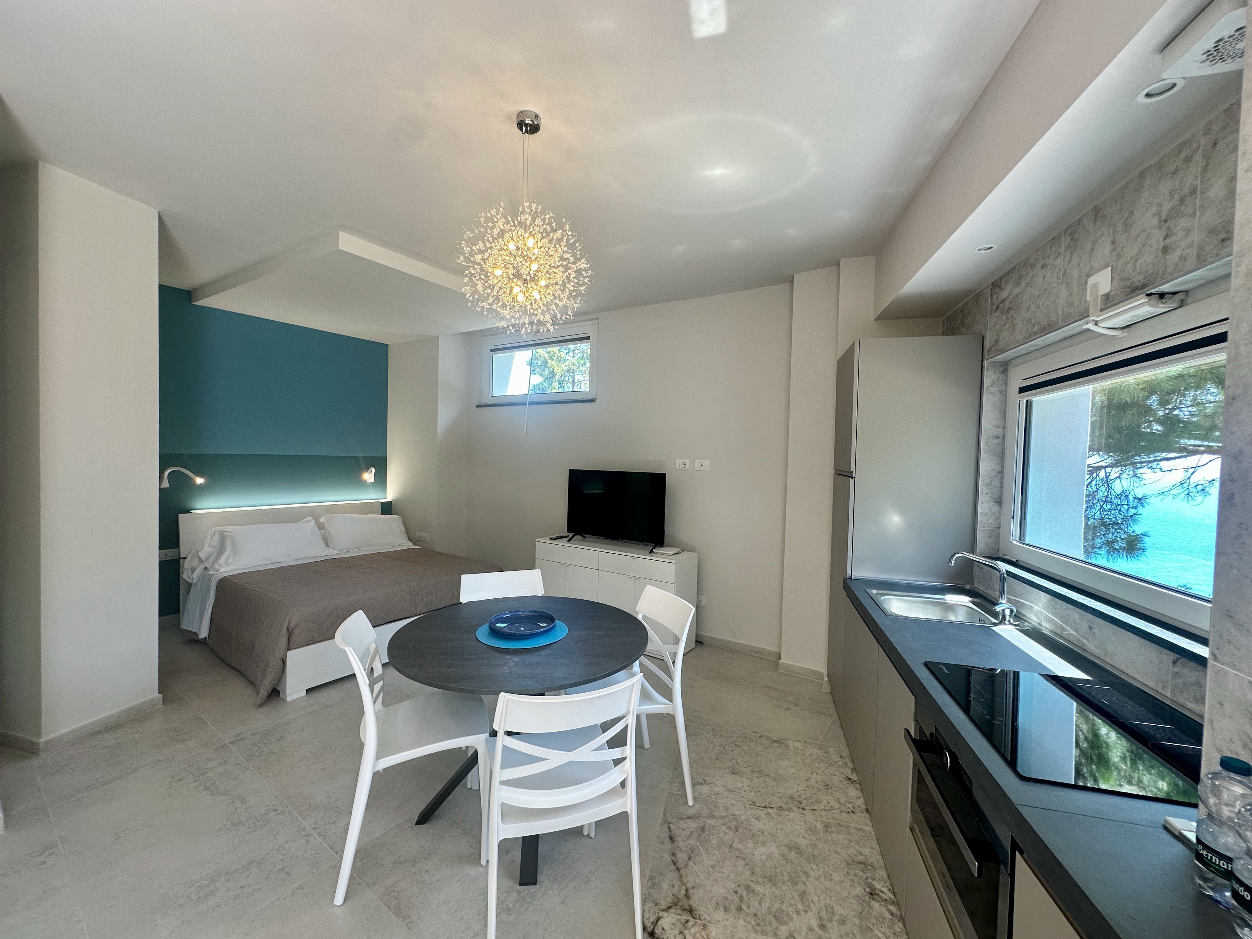 Spacious open-plan studio apartment featuring a sleeping area with a double bed and a living area with a sofa bed (140 cm wide), a smart TV, and a fully equipped kitchenette.
