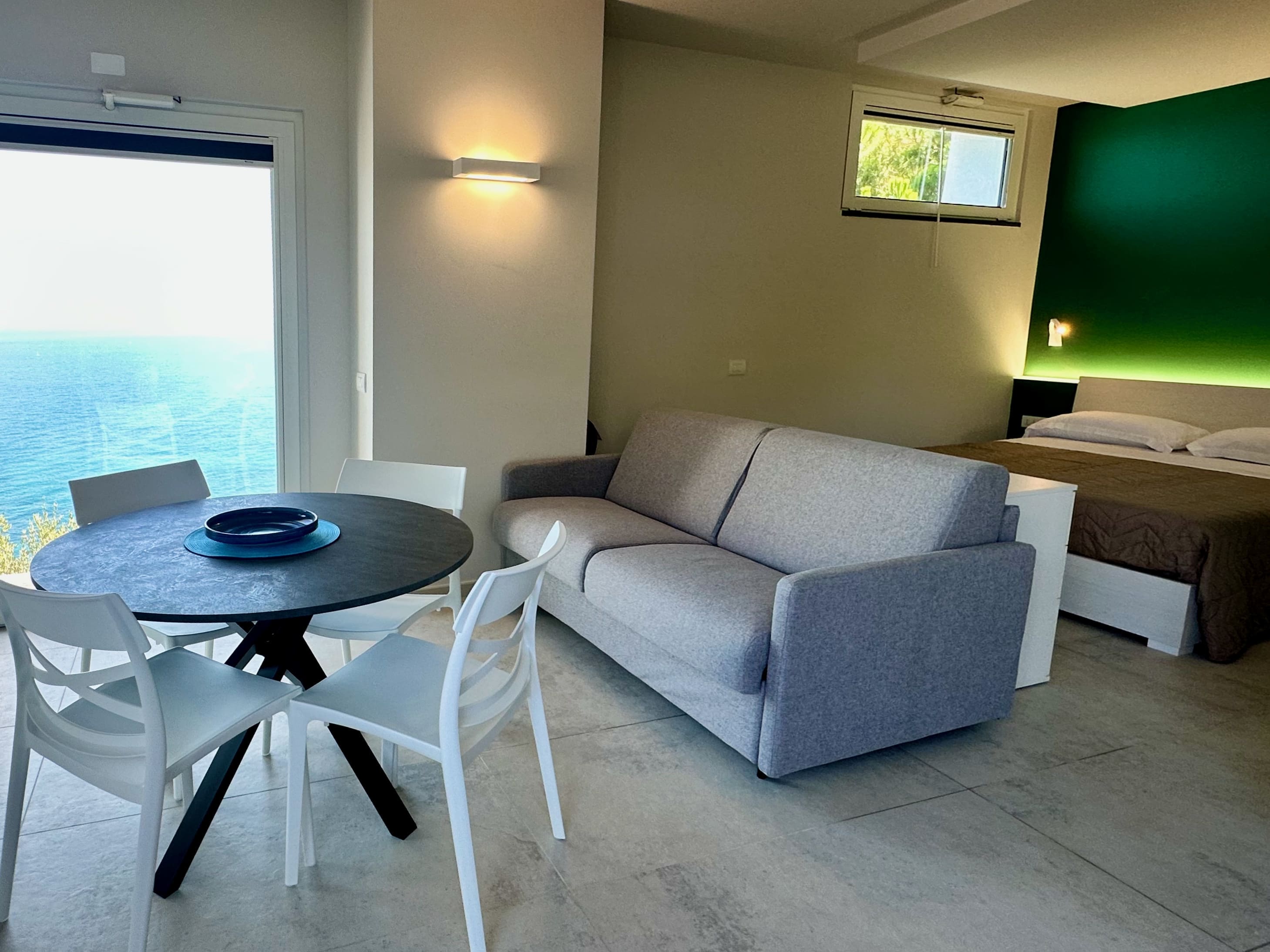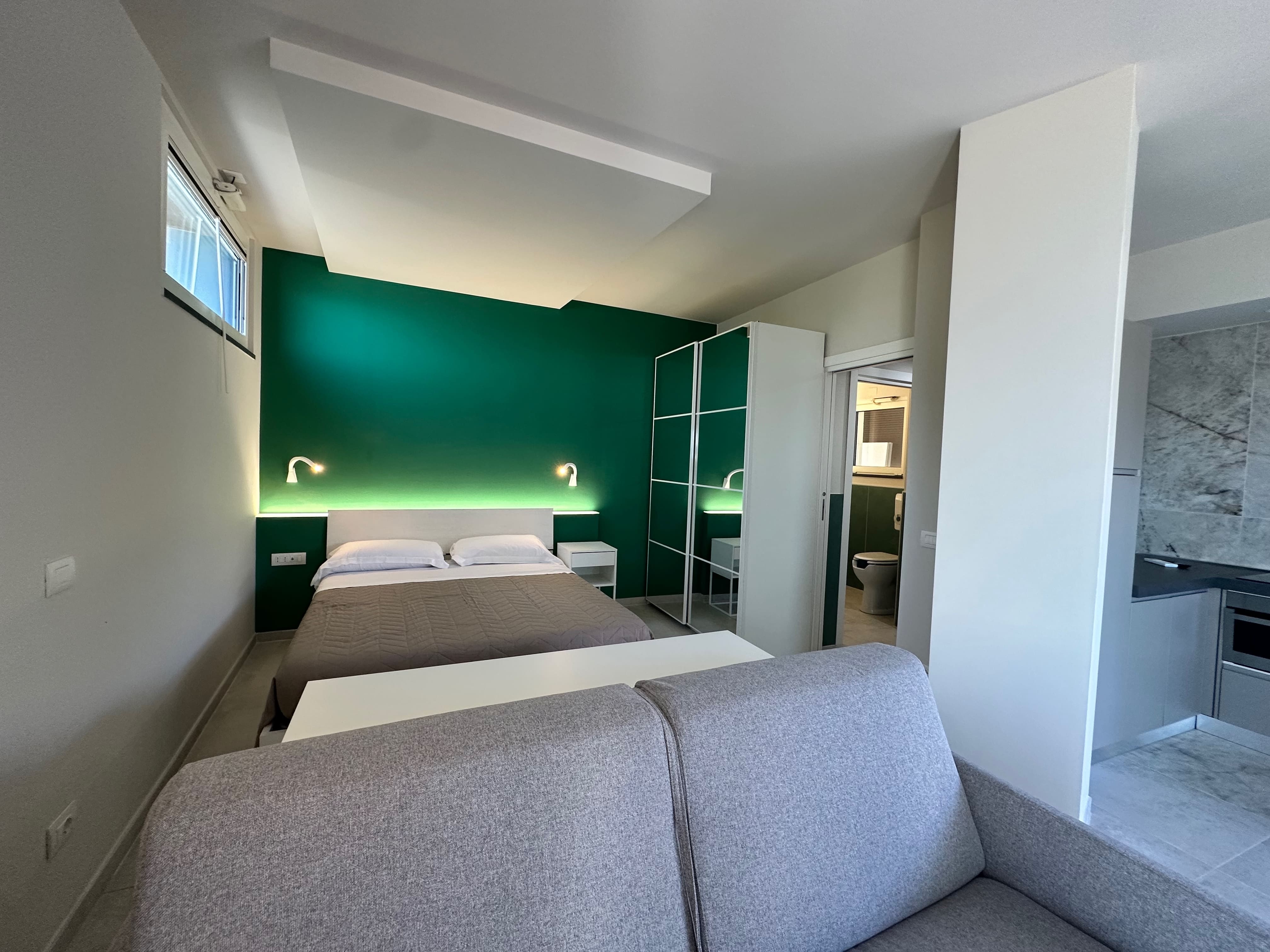 Spacious open-plan studio apartment featuring a sleeping area with a double bed and a living area with a sofa bed (140 cm wide), a smart TV, and a fully equipped kitchenette.