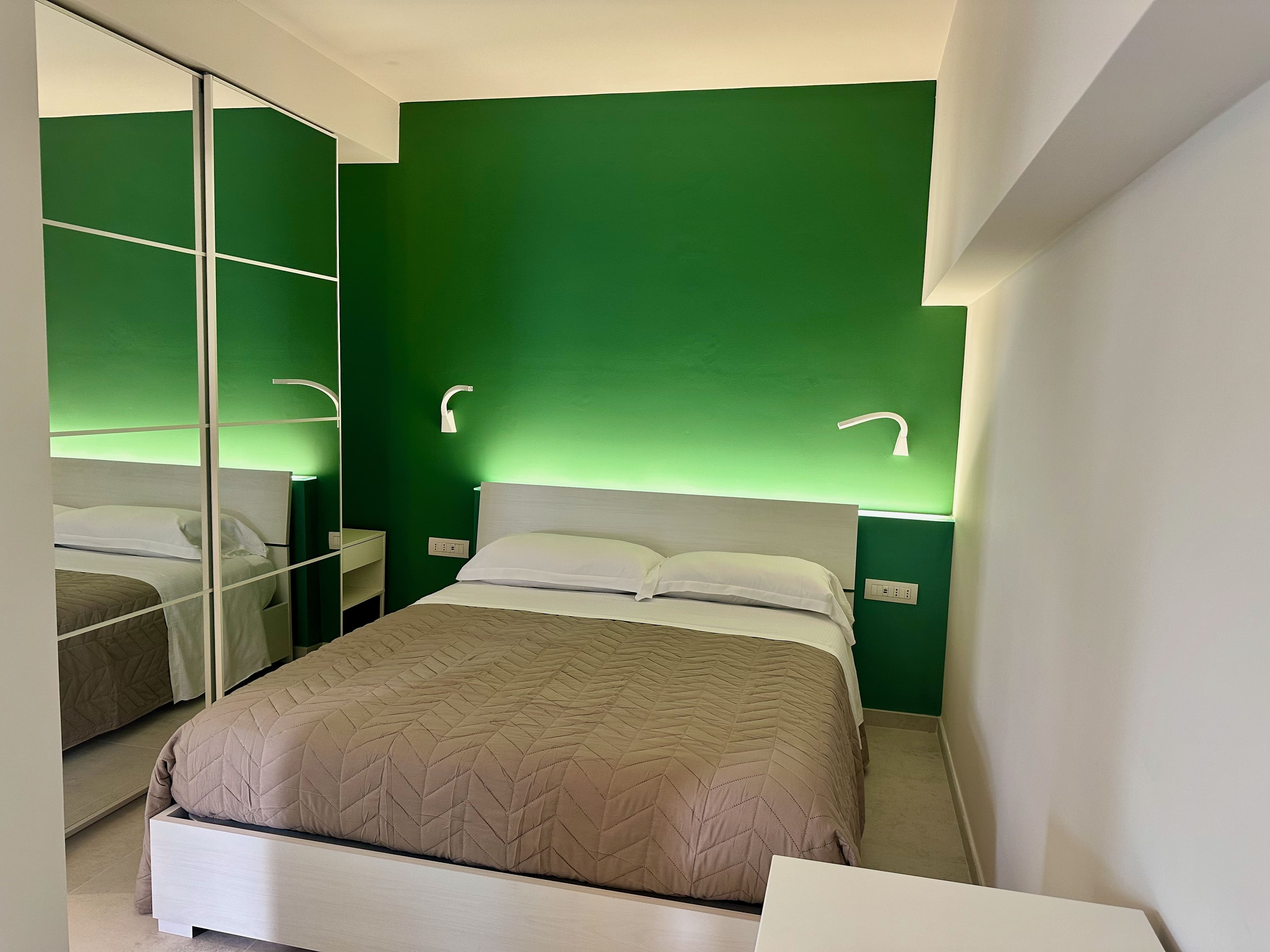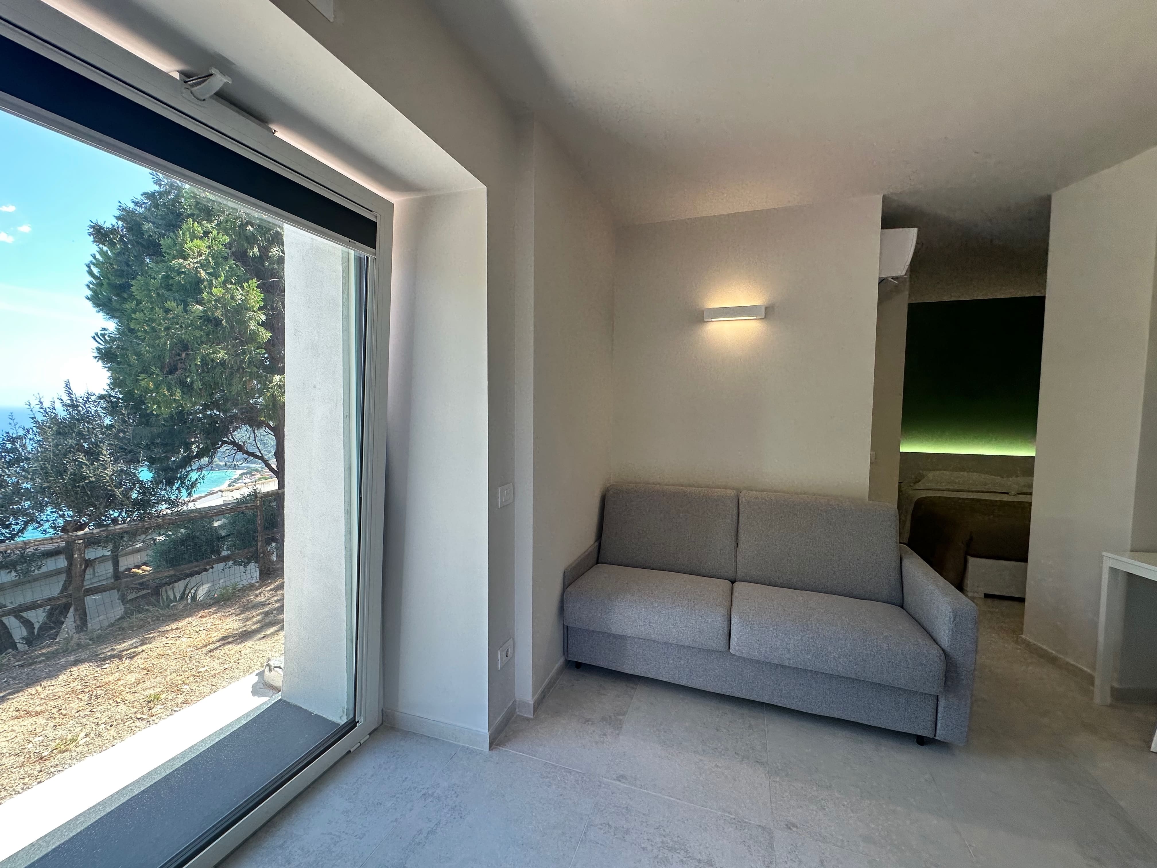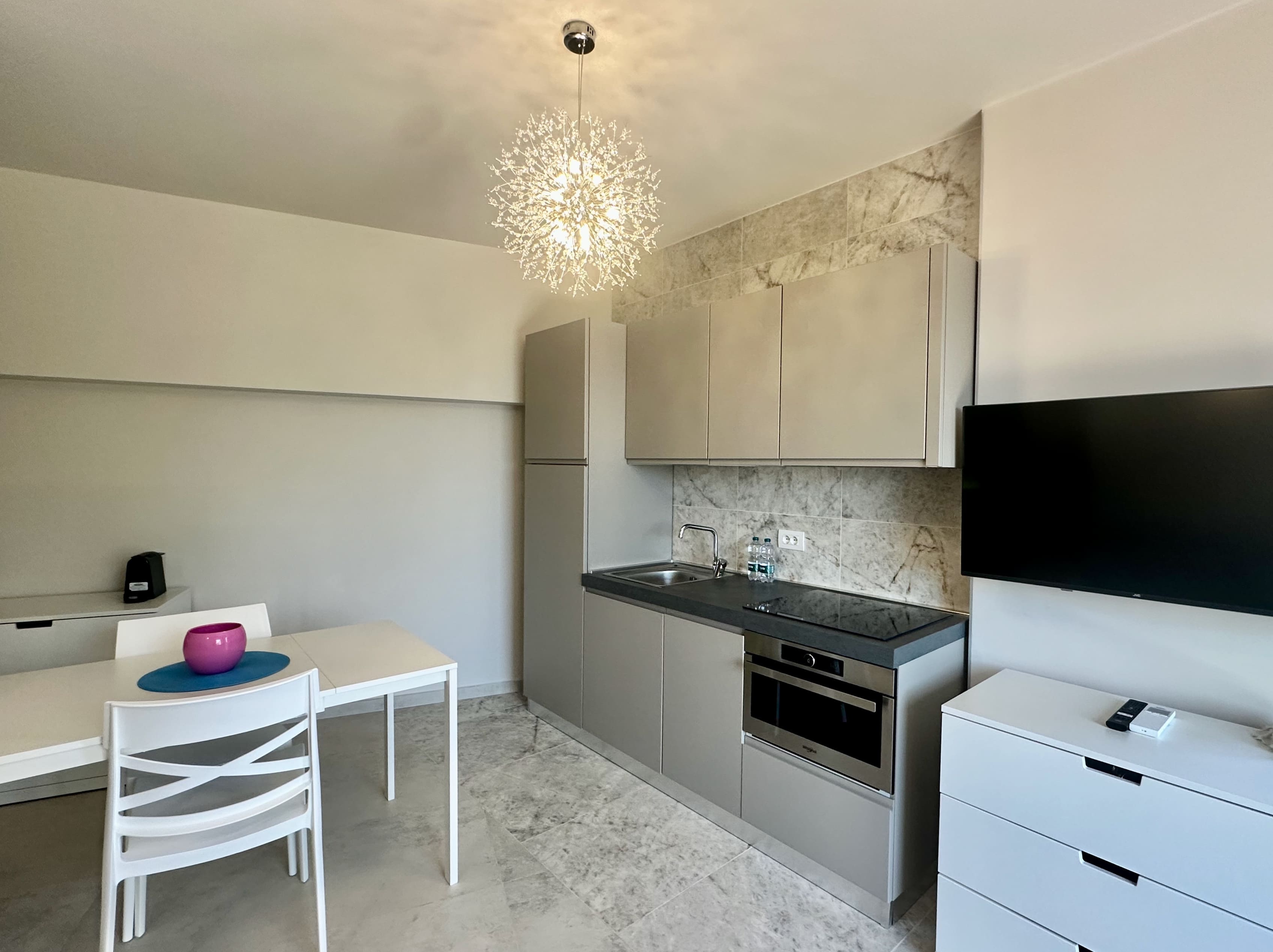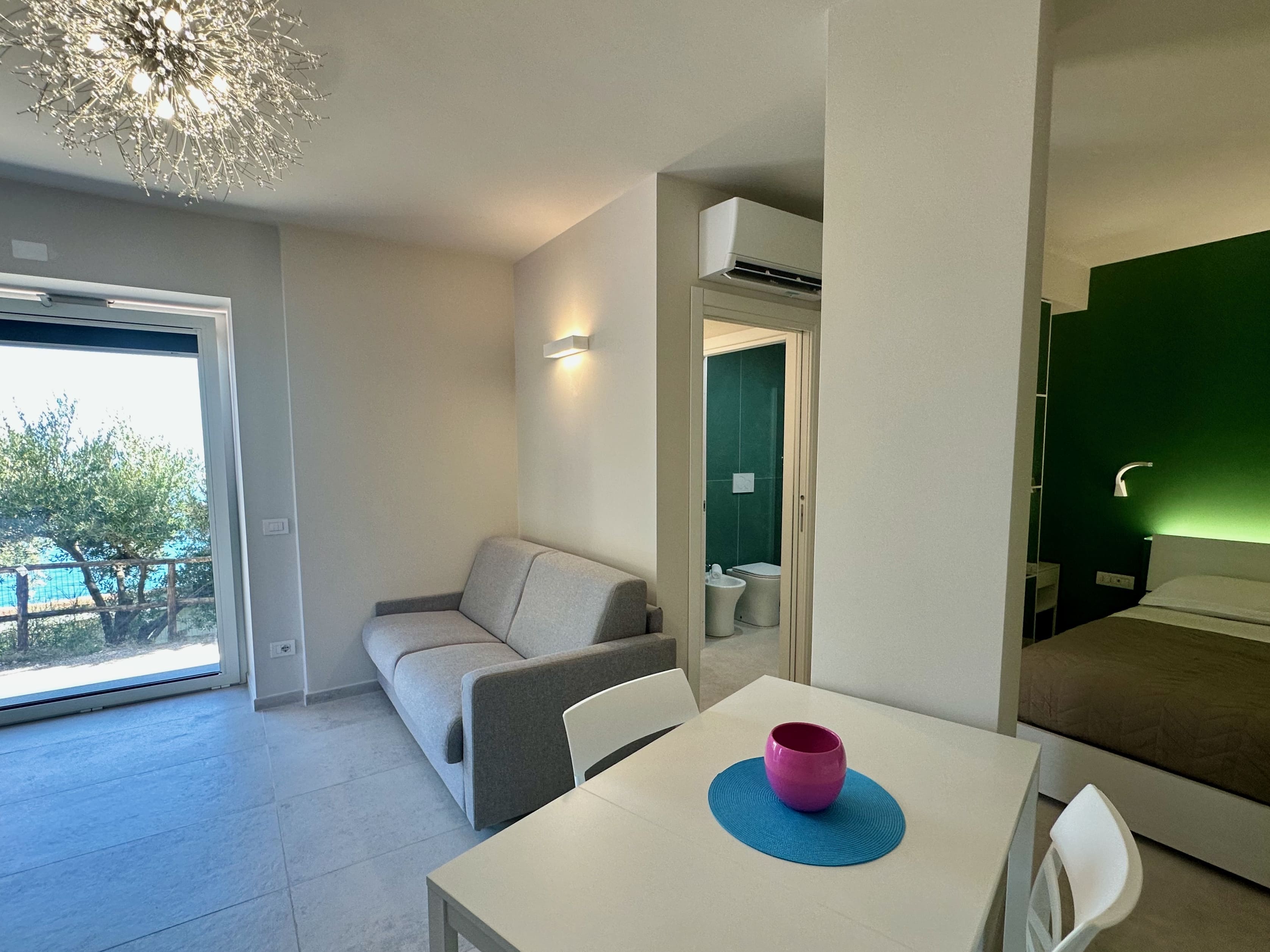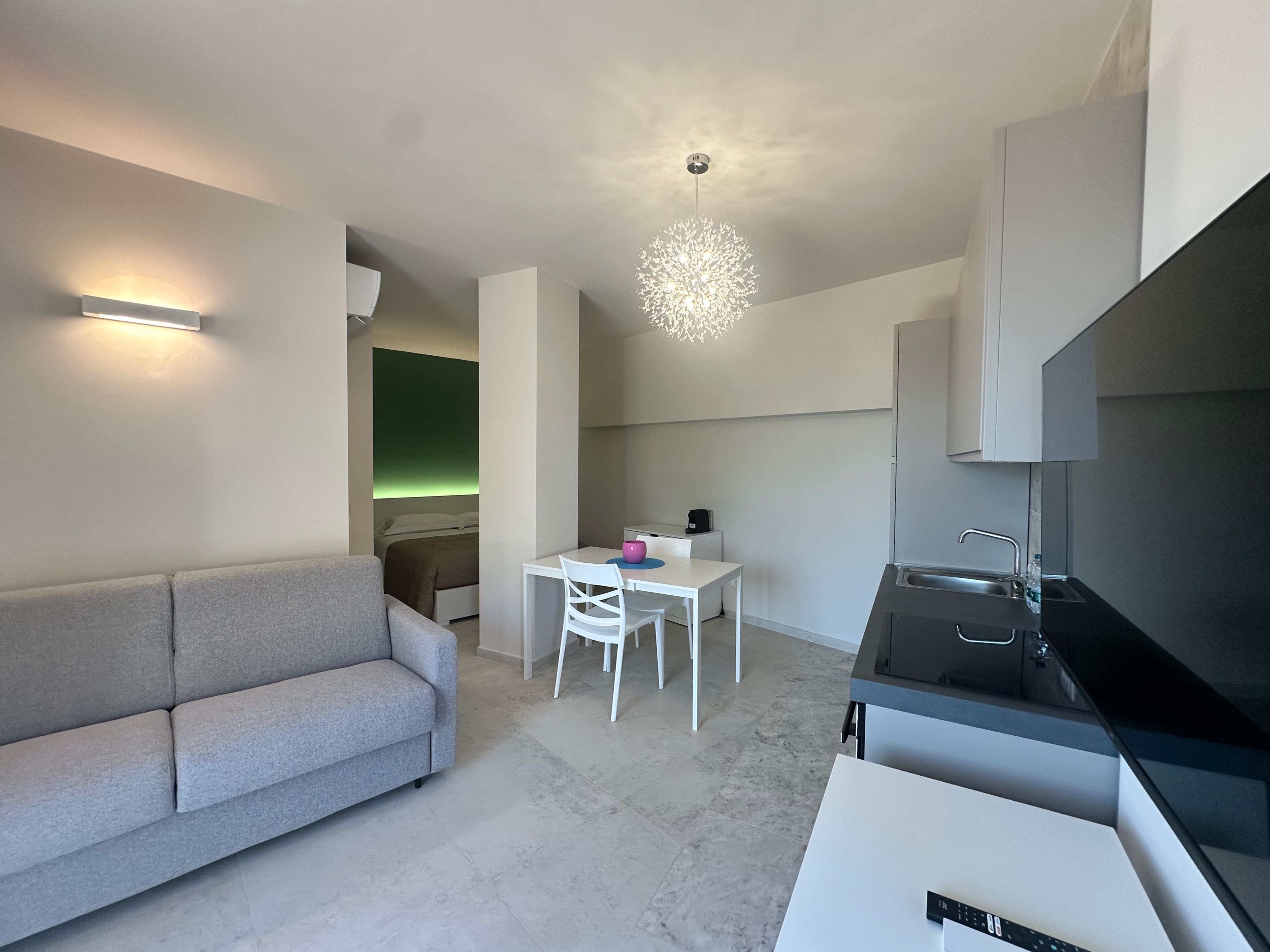 Spacious open-plan studio apartment featuring a sleeping area with a double bed and a living area with a sofa bed (140 cm wide), a smart TV, and a fully equipped kitchenette.