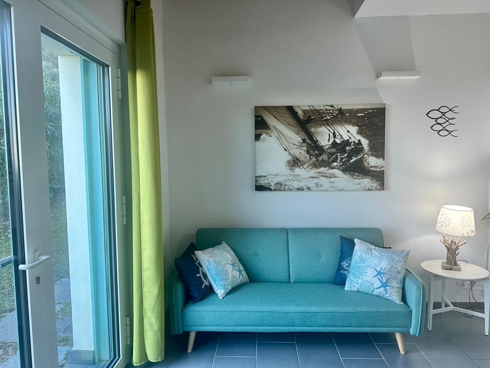 Nice apartment in a quite area, consists of two bedrooms, one with double bed and one with 2 single beds (80x190), a living room with kitchenette and sofa, spaciuos sea view garden. It is reached by some stairs.